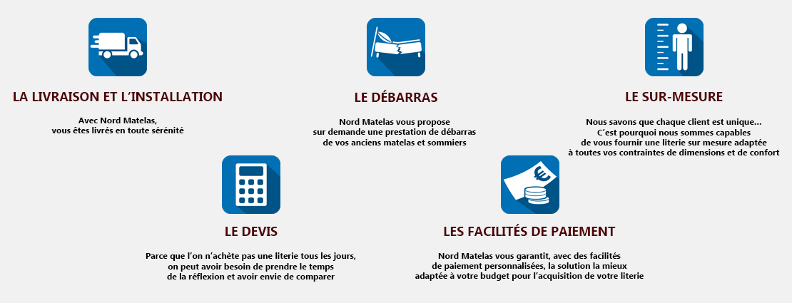 Nord Matelas vous offre un éventail complet de matelas et d'articles de literie pour tous types de dormeurs à des prix défiants toute concurrence. Votre sommeil est notre priorité. De la structure de lit au sommier en passant bien sûr par le matelas et les accessoires, nous vous aidons à trouver les produits qui sont aussi bien adaptés à votre façon de dormir qu'à votre budget.